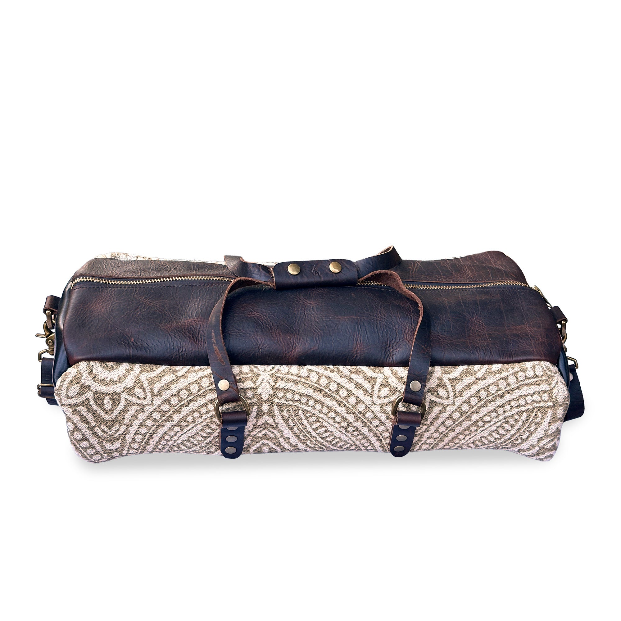 The Largo Carpet Duffle Bag is a modern evolution of the classic carpet bag. Its richly patterned carpet body wraps seamlessly from one side to the other, creating a striking visual statement. The top is crafted from dark brown bison leather, adding a bold contrast in both color and texture. It blends timeless craftsmanship with contemporary style.
