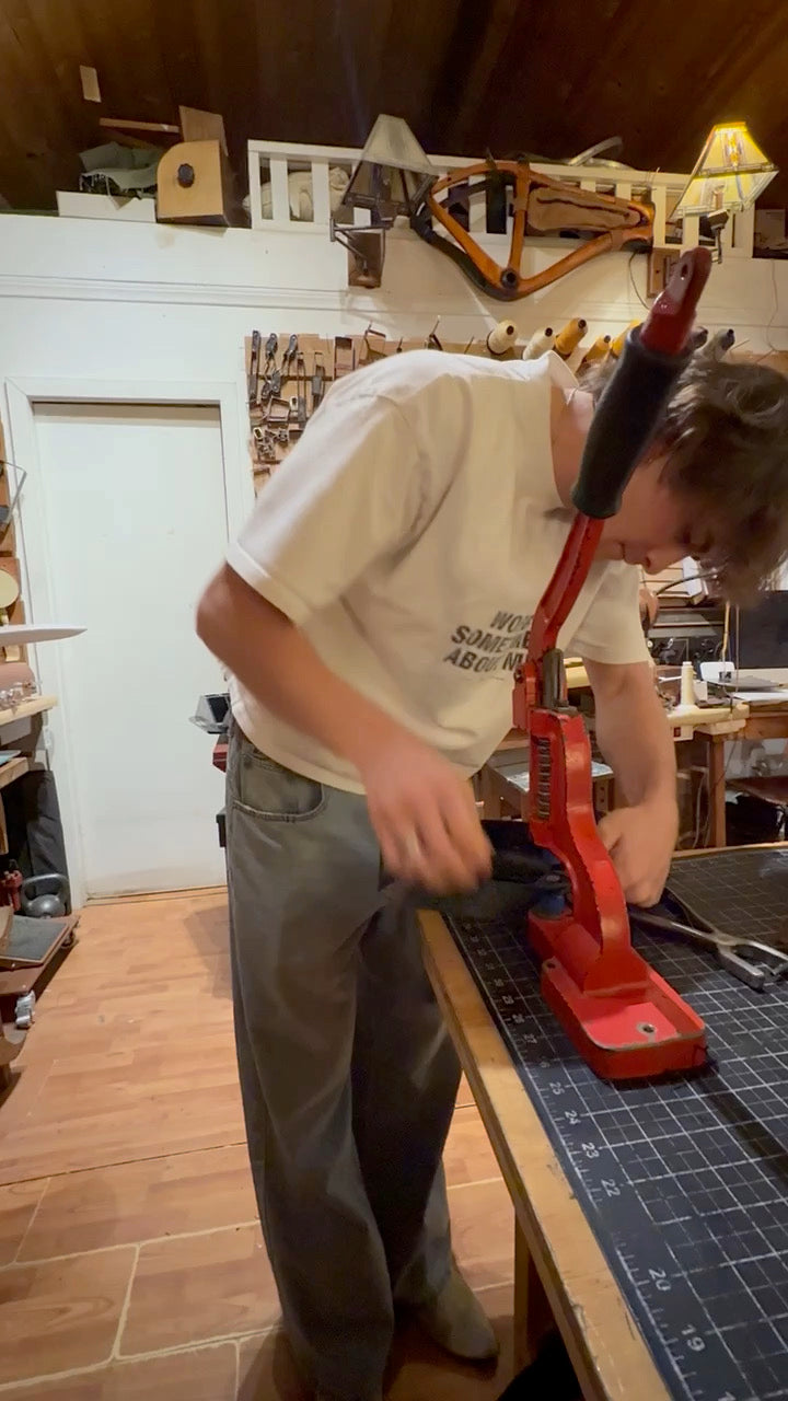 Leather shoulder bag workshop in Topanga. Spend about 3 hours learning the basics of leather crafting with our shoulder bag workshop. Learn to press and cut out the leather, sew the bag and add rivets and perhaps your name. We provide the leather, materials and hardware to make a bag. Leather options vary each week with a variety of classic and creative options. Throw your name on the bag if you want.